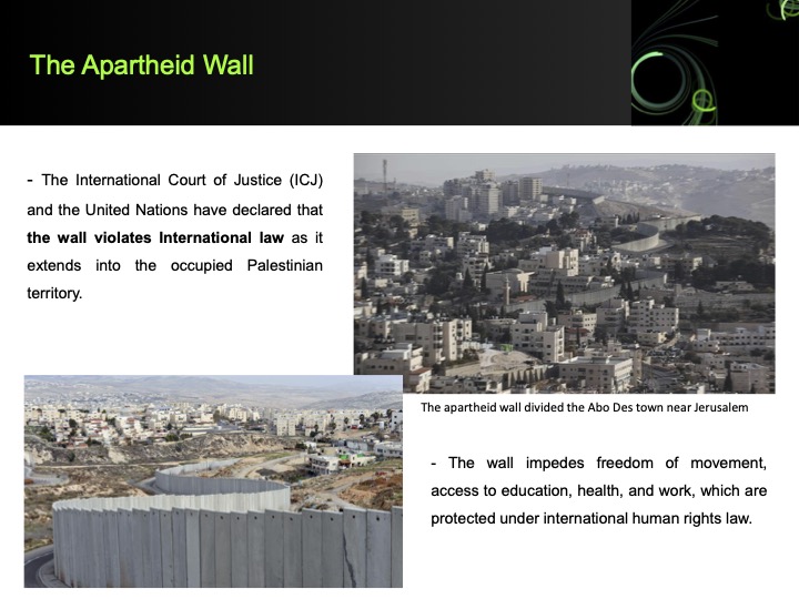 Une autre contrainte majeure est la barrière de séparation — souvent qualifiée de « mur d’apartheid » — qui traverse les territoires et isole des communautés ; dans des zones comme Abu Dis, près de Jérusalem, le mur divise littéralement les villages. La ségrégation est renforcée par des réseaux routiers conçus pour la mobilité des colons.