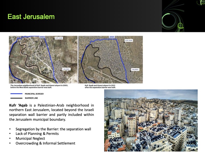 En conséquence, beaucoup bâtissent dans des villages périphériques comme Kufr Aqab, près de Ramallah, qui se développent rapidement mais manquent d’infrastructures, sont surpeuplés et prennent la forme de quartiers informels.