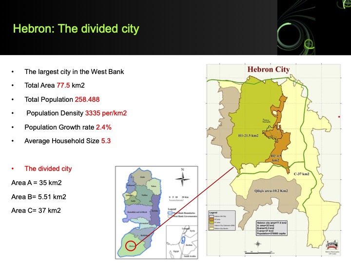 Des colonies israéliennes se trouvent à l’intérieur de H2. Le territoire municipal d’Hébron dépasse 77 km² et compte environ 258 000 habitants, avec une densité supérieure à 3 000 habitants par km².
