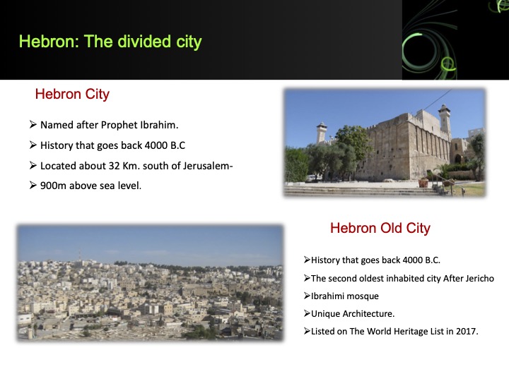 Hébron est divisée de manière unique, au-delà des zones A, B et C, en H1 et H2 : H1 est sous contrôle civil palestinien, tandis que H2 est sous contrôle israélien et comprend la vieille ville classée par l’UNESCO.