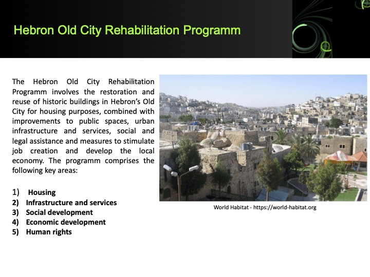 C’est un programme palestinien de réhabilitation de la vieille ville après le départ d’habitants consécutif à l’accord sur Hébron (qui a instauré la division H1/H2). Un comité de réhabilitation a restauré les bâtiments traditionnels et encouragé le retour des résidents et des activités économiques. Le projet a permis de rénover plus de 1 000 logements, bénéficiant à environ 6 000 personnes, tout en améliorant les infrastructures, les services et les conditions socio-économiques.